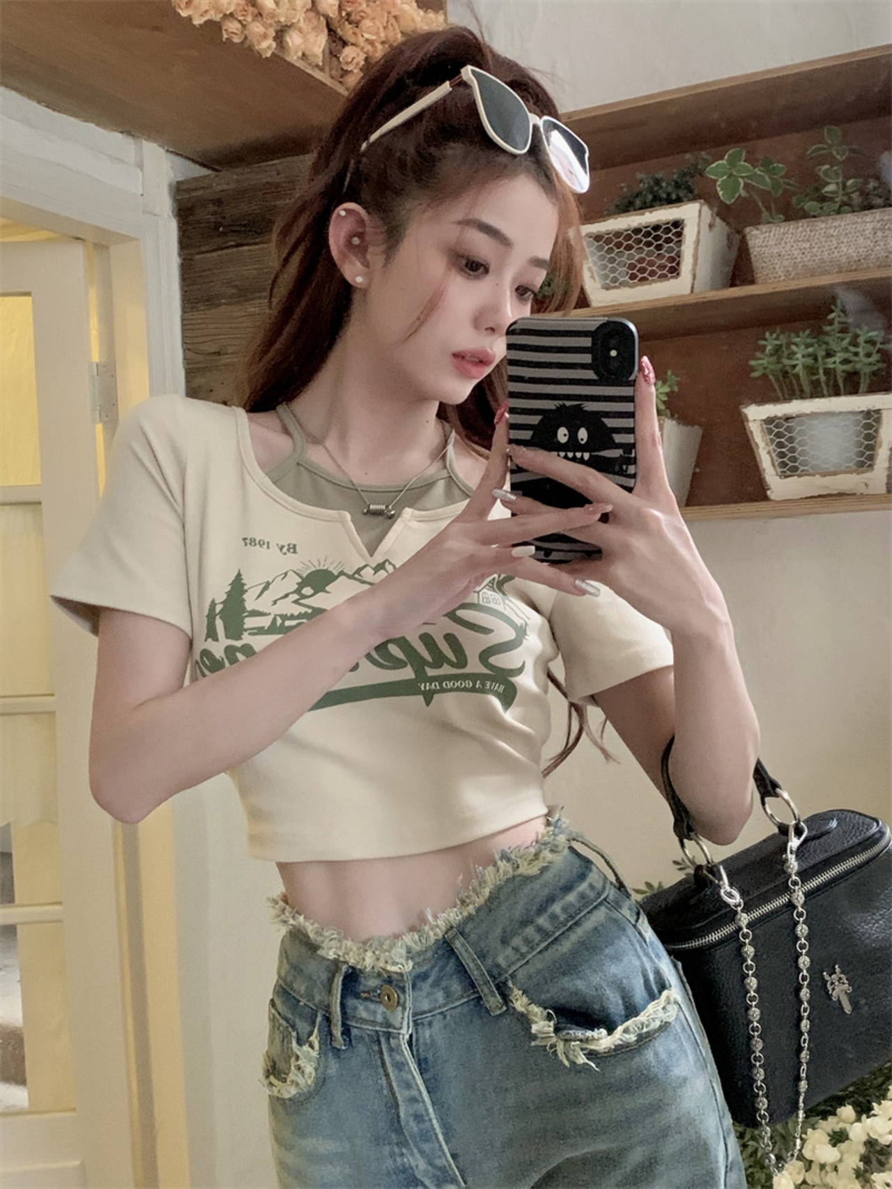 フェイクレイヤードトップス クロップド ショート タイトトップス ロゴ 着回し シンプル カジュアル レトロ 韓国ファッション S-L
