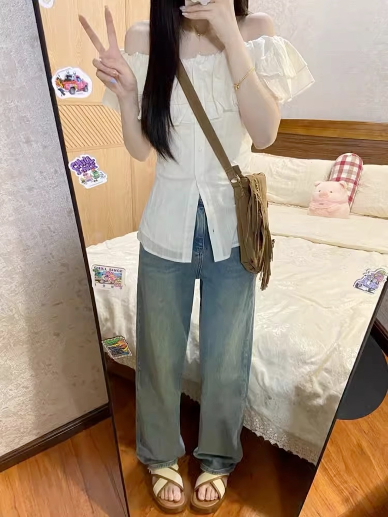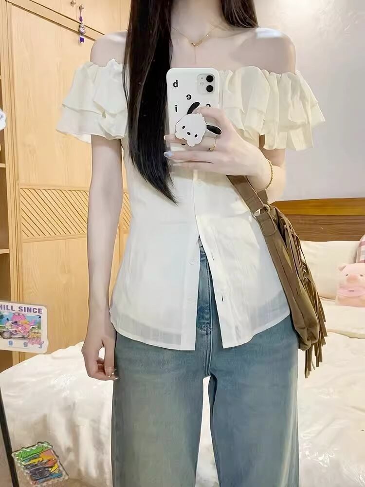 オフショルダー トップス ブラウン ガーリー シャツ シンプル デートコーデ 夏 トレンド 定番 カジュアル 韓国ファッション S-L