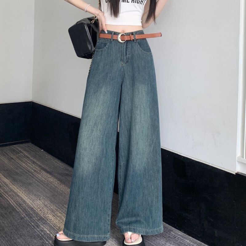 デニムパンツ ワイドジーンズ ロングパンツ デニム ボトム 脚長 ハイウエスト 着回し シンプル カジュアル 韓国ファッション S-XL