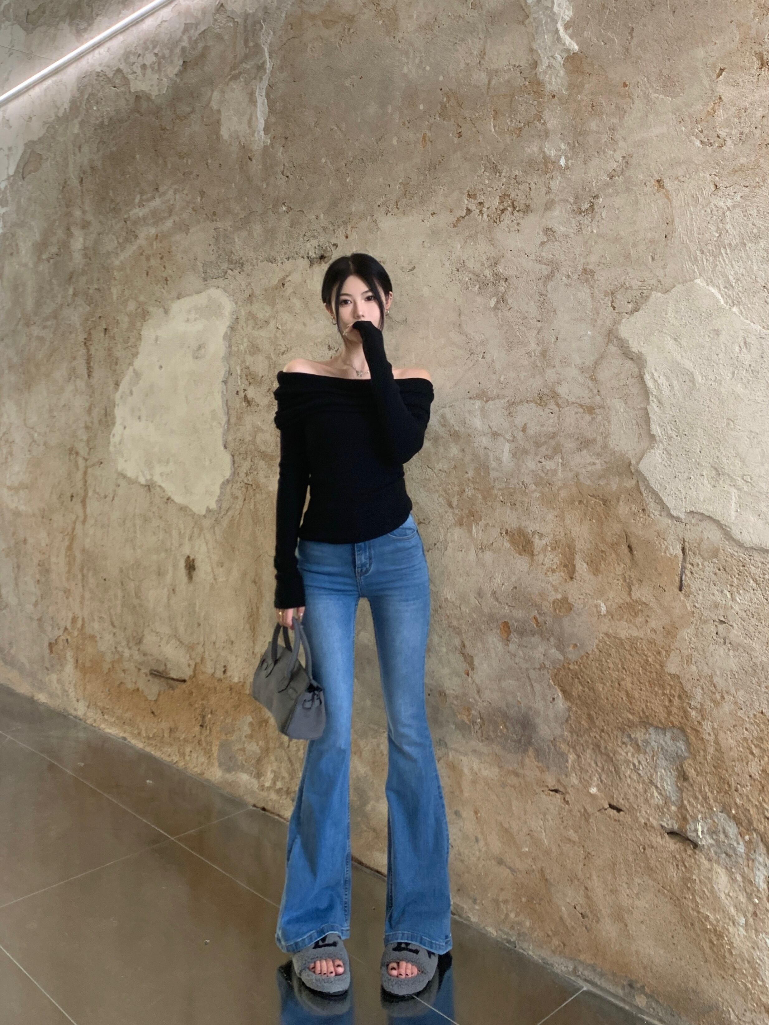シンプル 長袖 ボトリングシャツ インナー 秋ファッション カジュアル 可愛い 大人 おでかけ 肩出しファッション