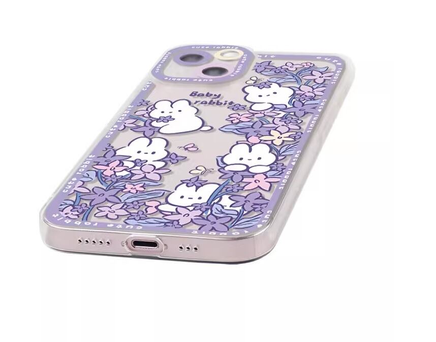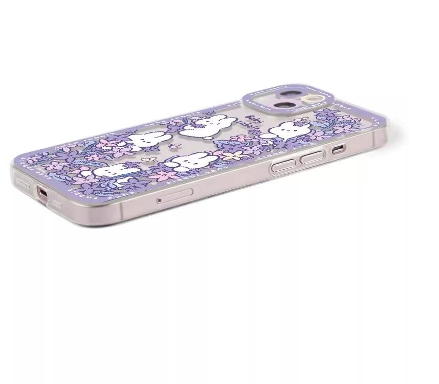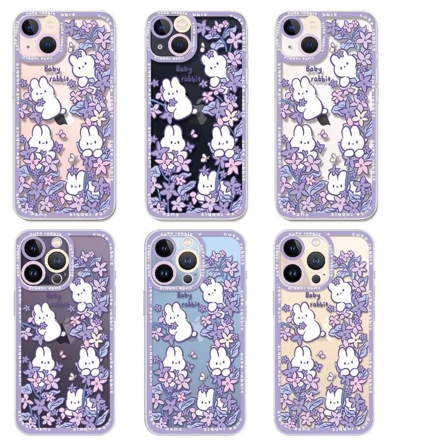 iPhoneケース ストラップ付き パープル 花柄 フラワー うさちゃん ウサギ ラビット アニマル ロゴ クリア ポップ 韓国ファッション