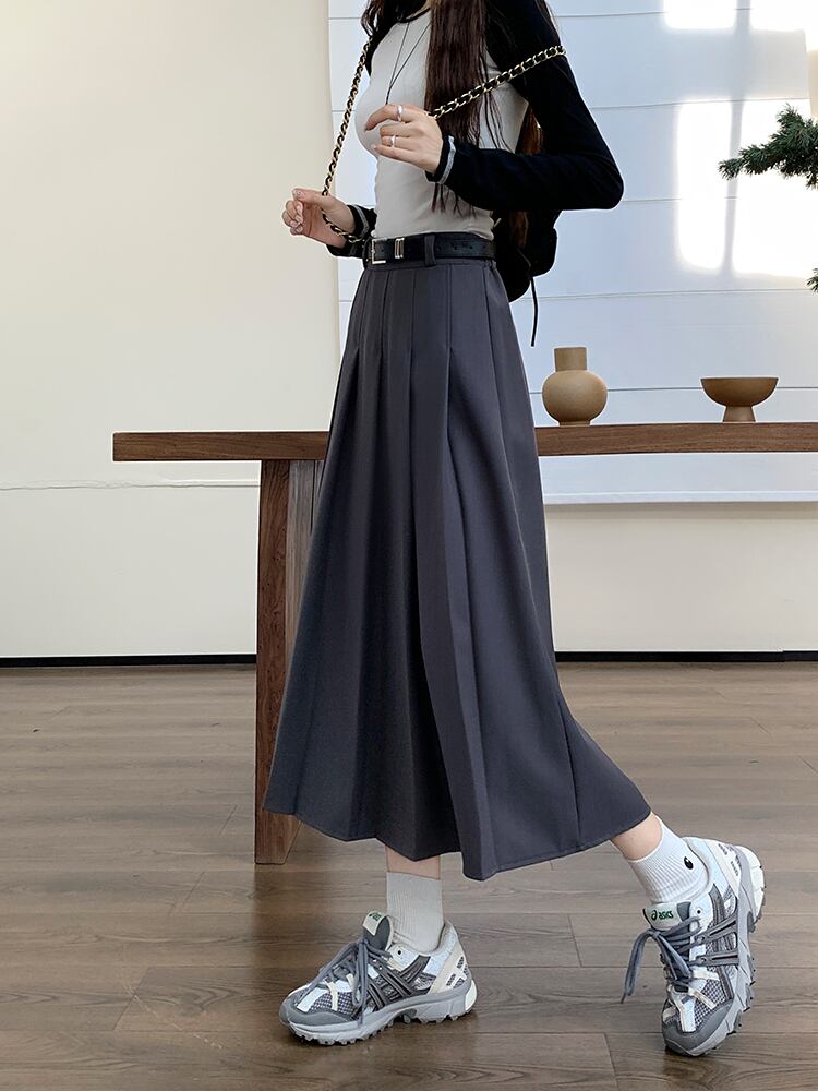 ドレーピースーツスカート ロング ミドル丈プリーツAラインスカート 韓国ファッション レディース カジュアル 可愛い 大人 シンプル