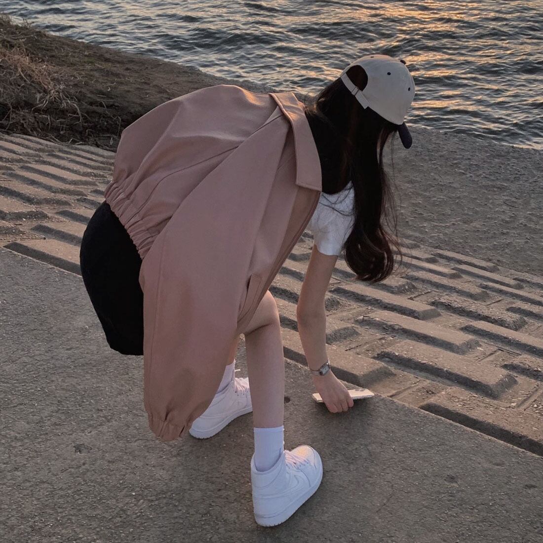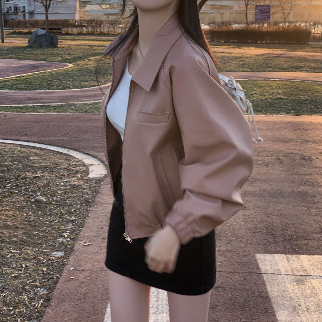 PUレザージャケット アウター エコレザー 長袖 ショート ブルゾン 無地 ワントーン 秋 シンプル カジュアル トレンド 韓国ファッション