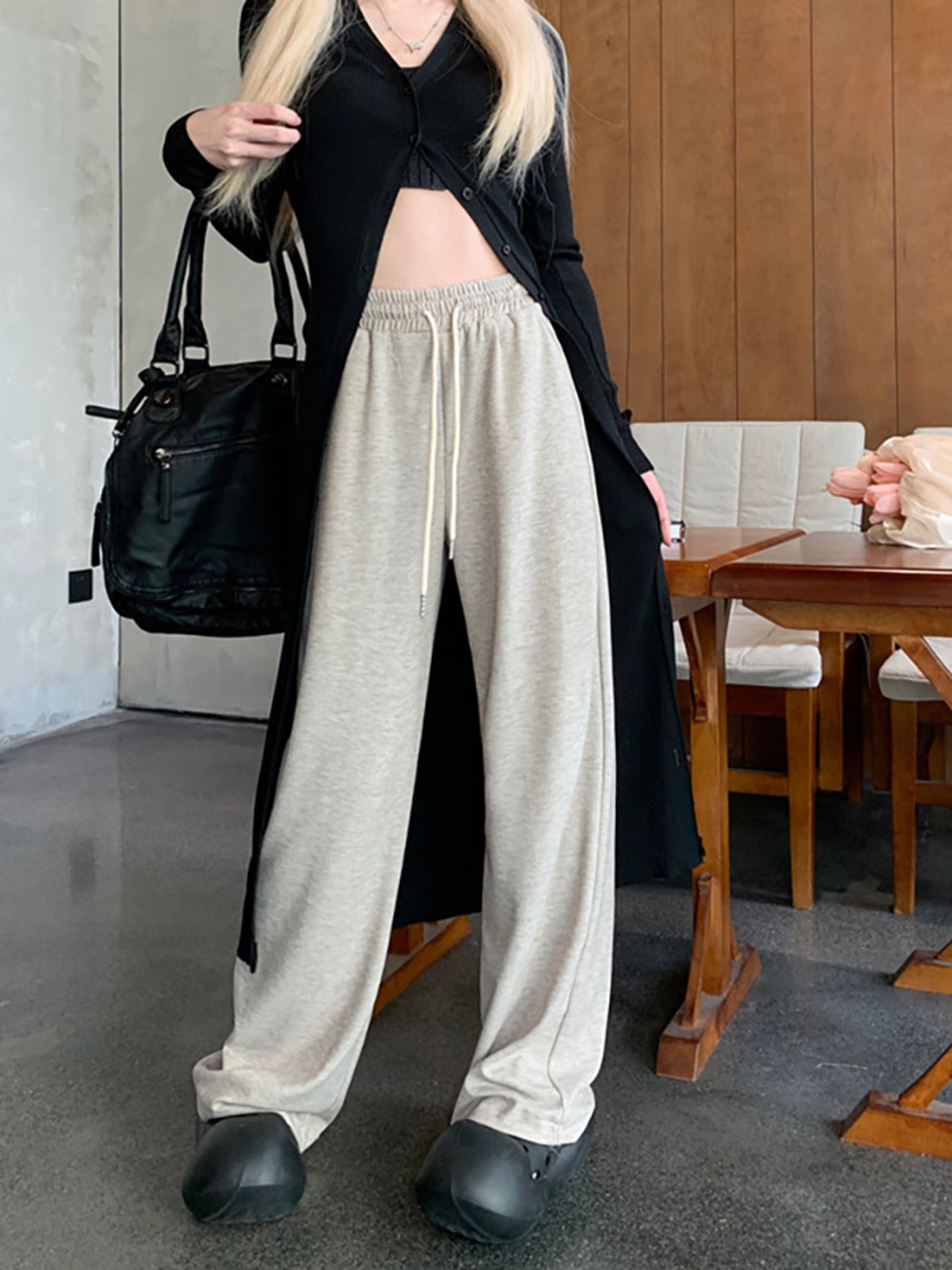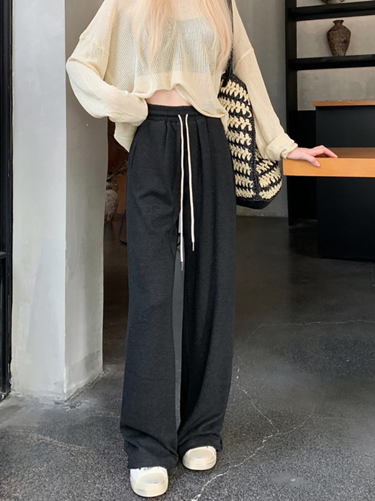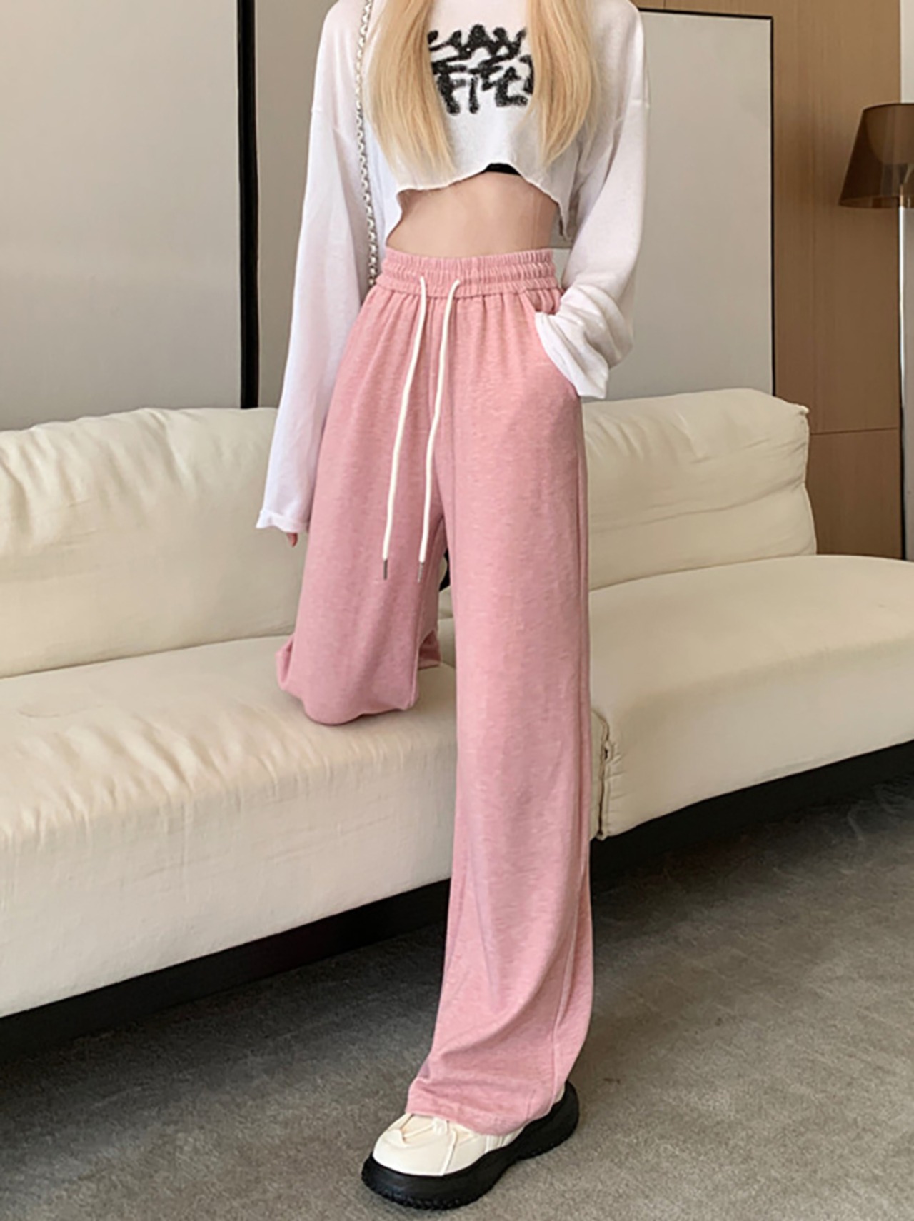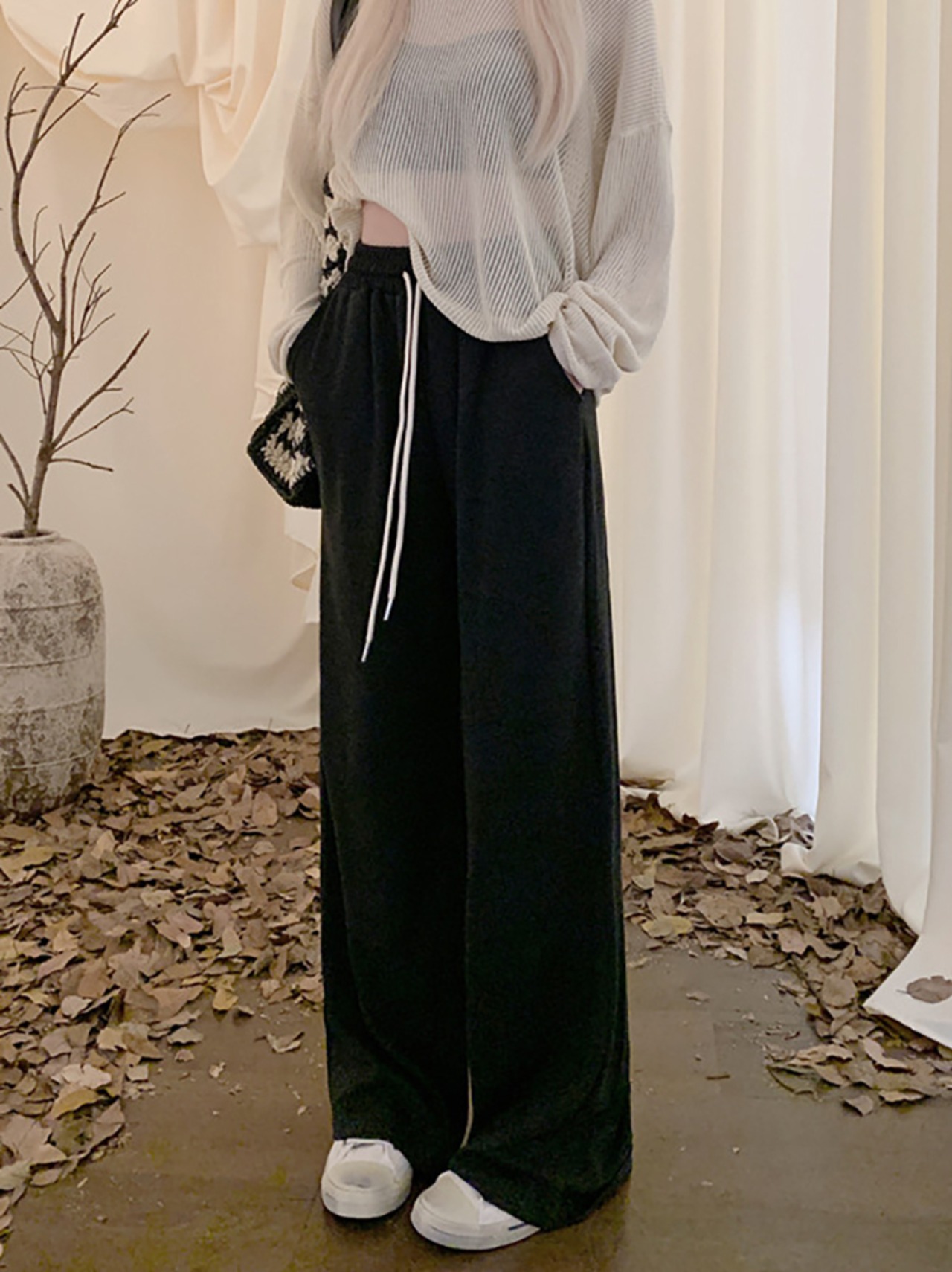 ウエストドレープカジュアルパンツ レディース ハイウエスト ワイドレッグフロアレングスパンツ 秋 韓国ファッション カジュアル 可愛い シンプル