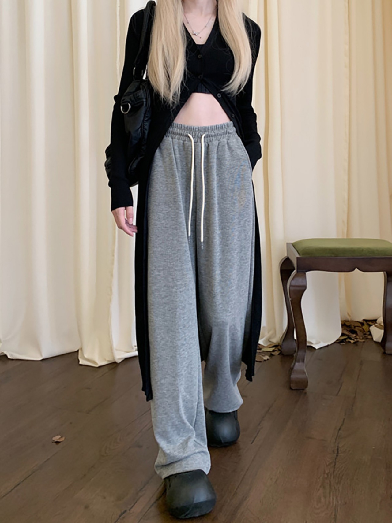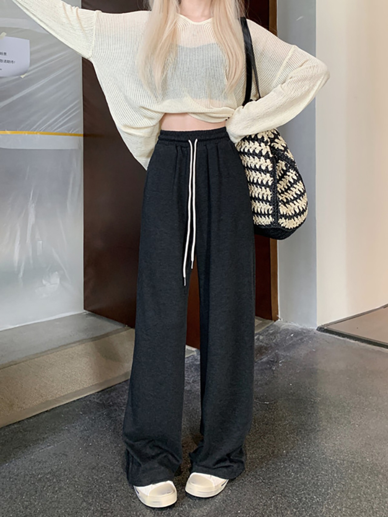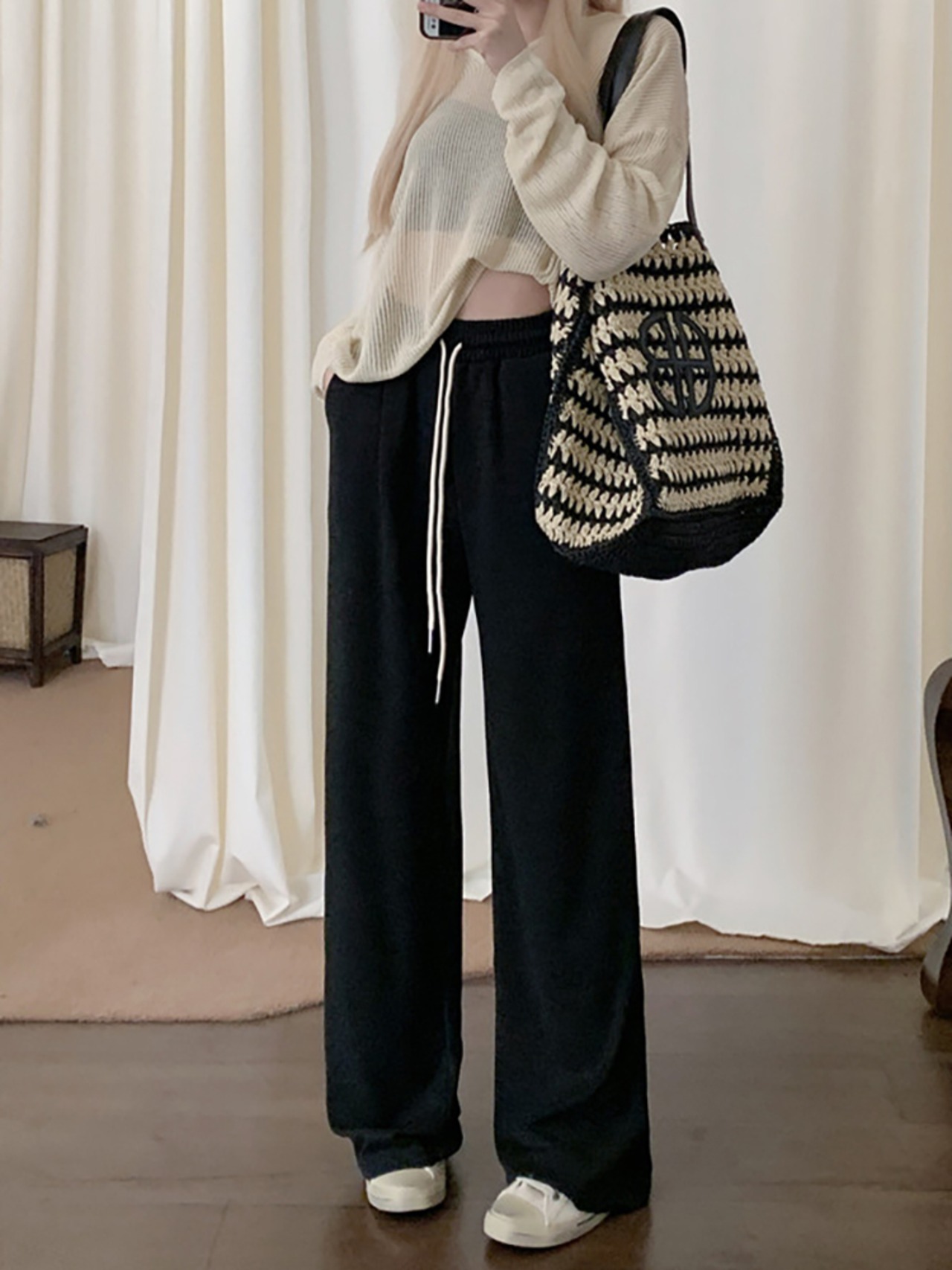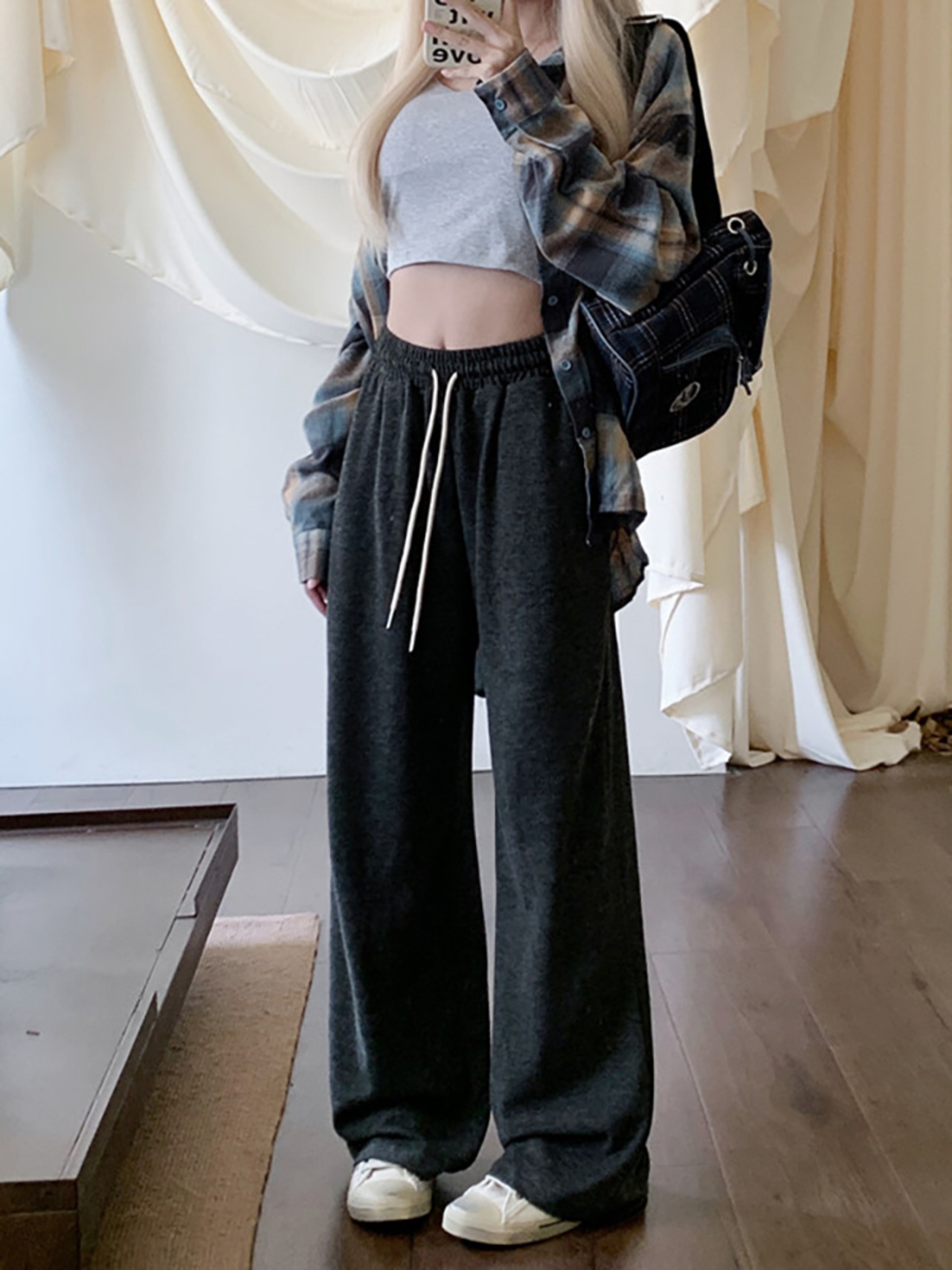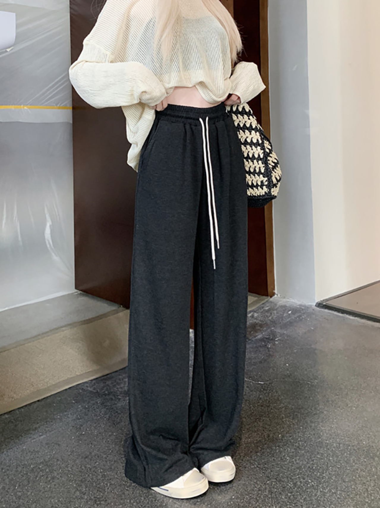 ウエストドレープカジュアルパンツ レディース ハイウエスト ワイドレッグフロアレングスパンツ 秋 韓国ファッション カジュアル 可愛い シンプル