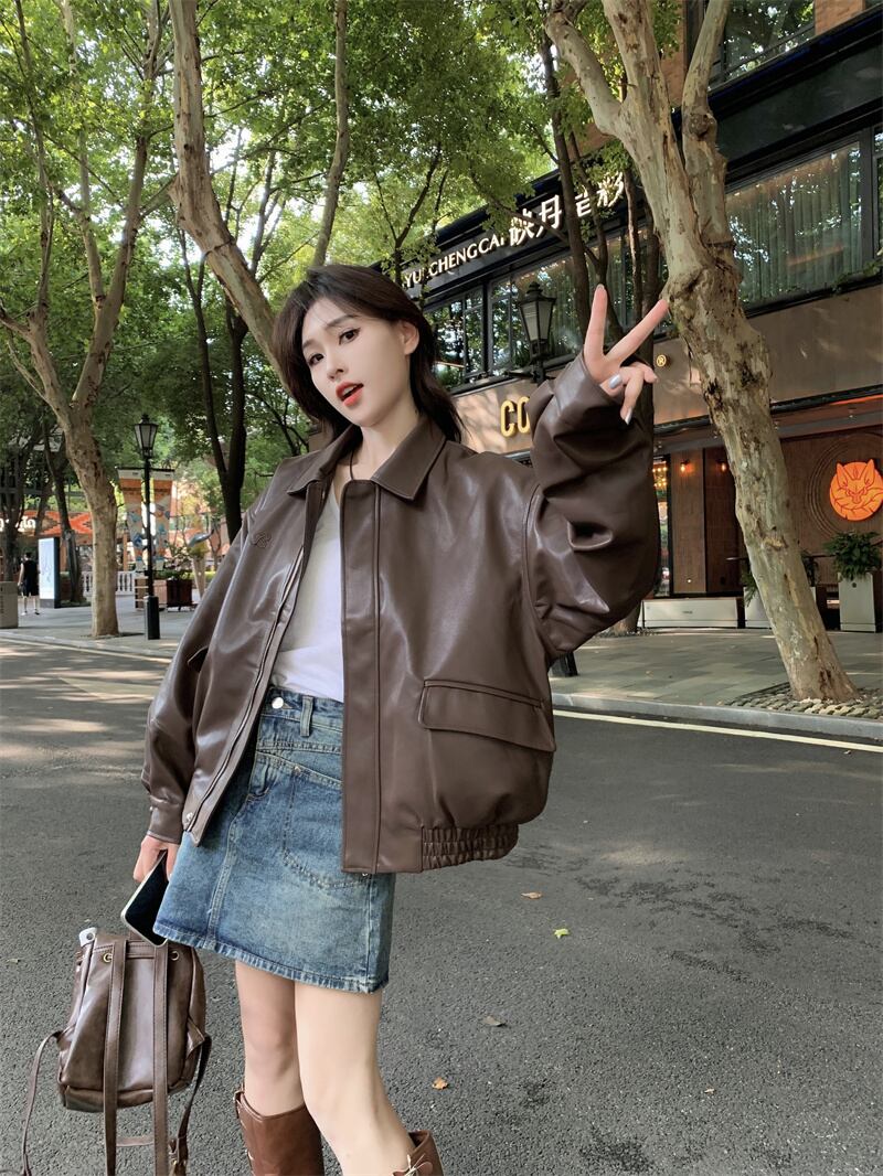 レザージャケット 長袖ジャケットトップ 韓国ファッション レディース 可愛い カジュアル シンプル
