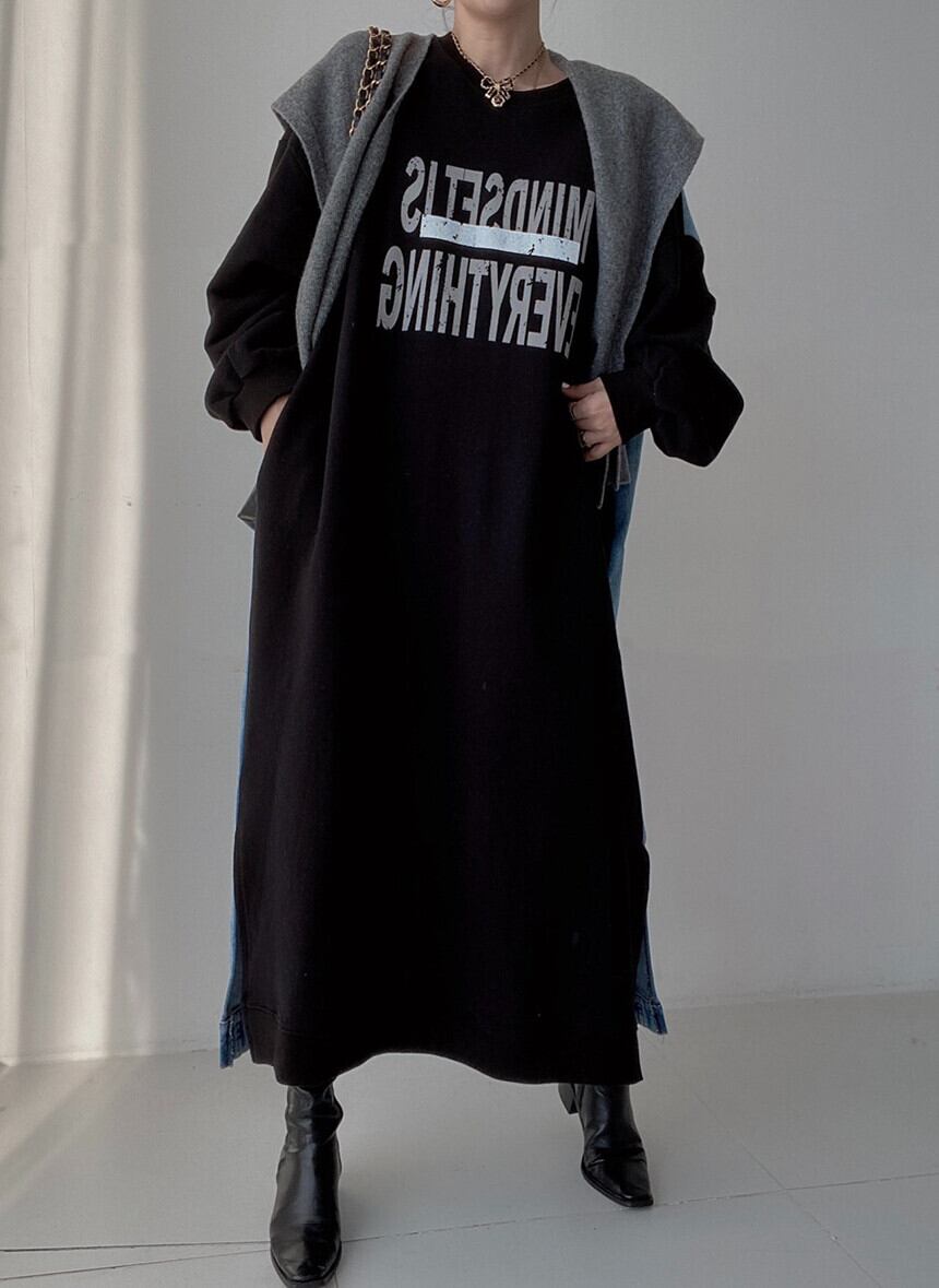 ロゴワンピース ドッキングワンピ 異素材 デニム ロング ワンピ スウェットワンピ アメカジ 長袖 シンプル カジュアル 韓国ファッション 3color