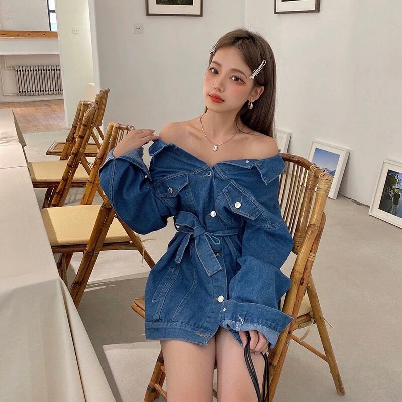 NEW【オフショルワンピ】春トレンド ワンピース ミニスカート オフショルダー オフショル デニム ワンカラー S-L