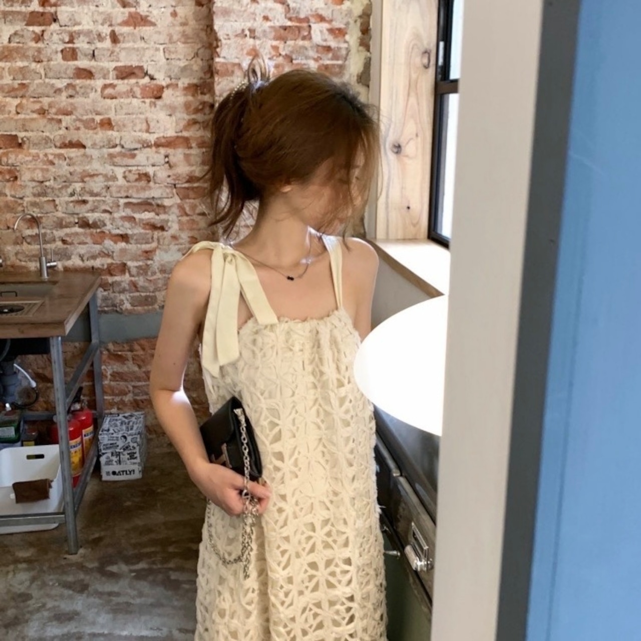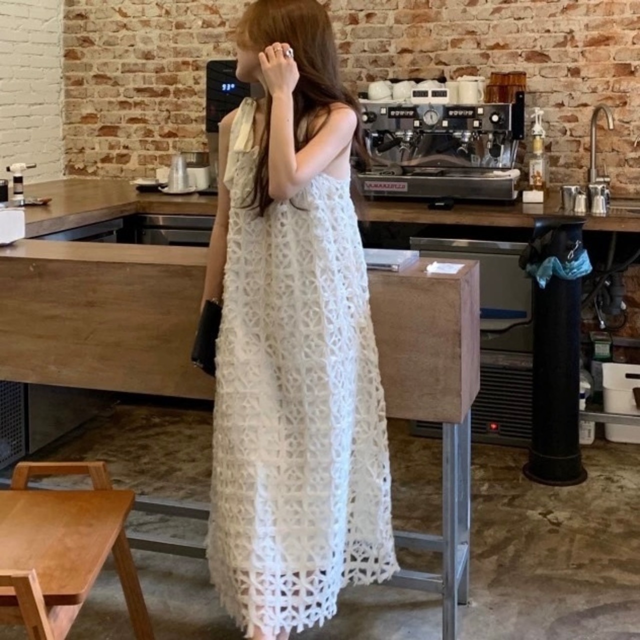 透け感がかわいいワンピース。ショルダーはリボンになっていて、海や暖かい季節にピッタリ。春はカーディガンやパーカーを羽織っても使えるワンピース。