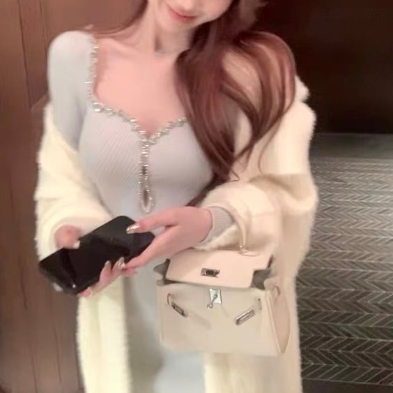【春アイテム】 春ニットワンピース ビジューライン ロング丈 長袖 きれいめ 韓国ファッション