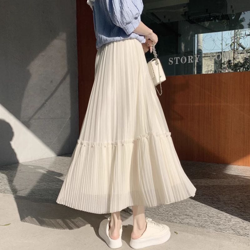 【ガーリーコーデ】プリーツスカート ロング丈 無地 Aライン 韓国ファッション
