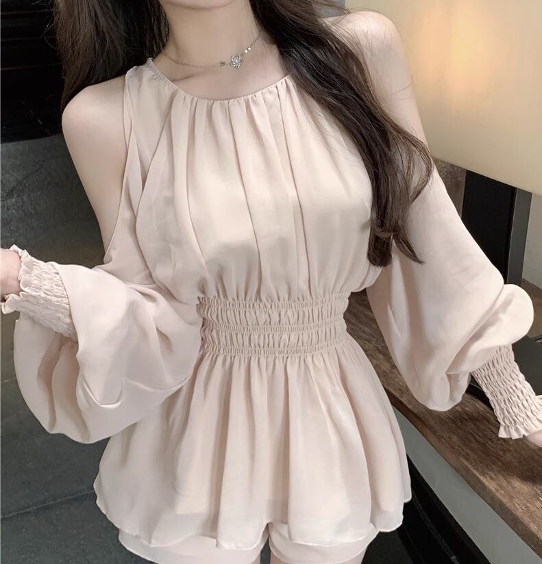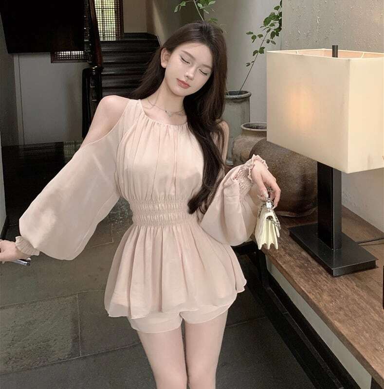 【セットアップ】オープンショルダー 肩出し セットアップ シフォン ツーピース 上下セット トップス ショートパンツ ボトム ガーリー 韓国ファッション