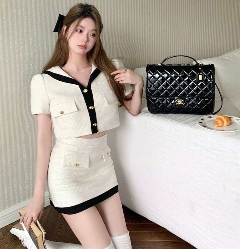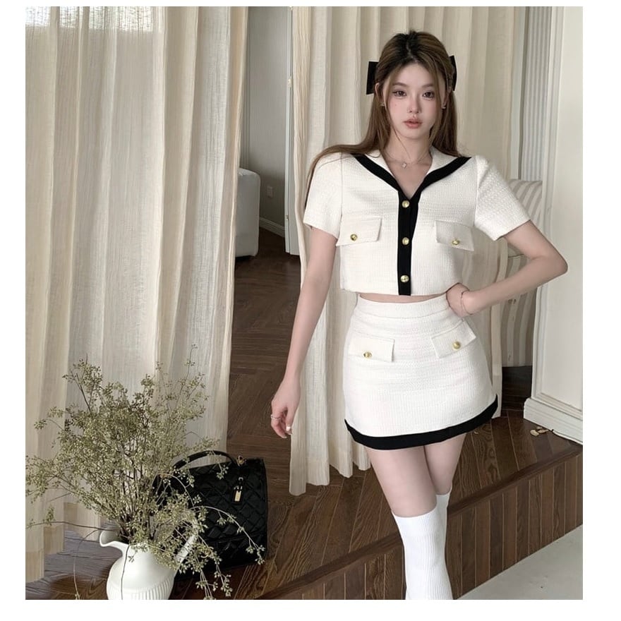 バイカラーセットアップ 上下セット セーラー襟付き ミニスカート フェミニン 韓国ファッション KY-31