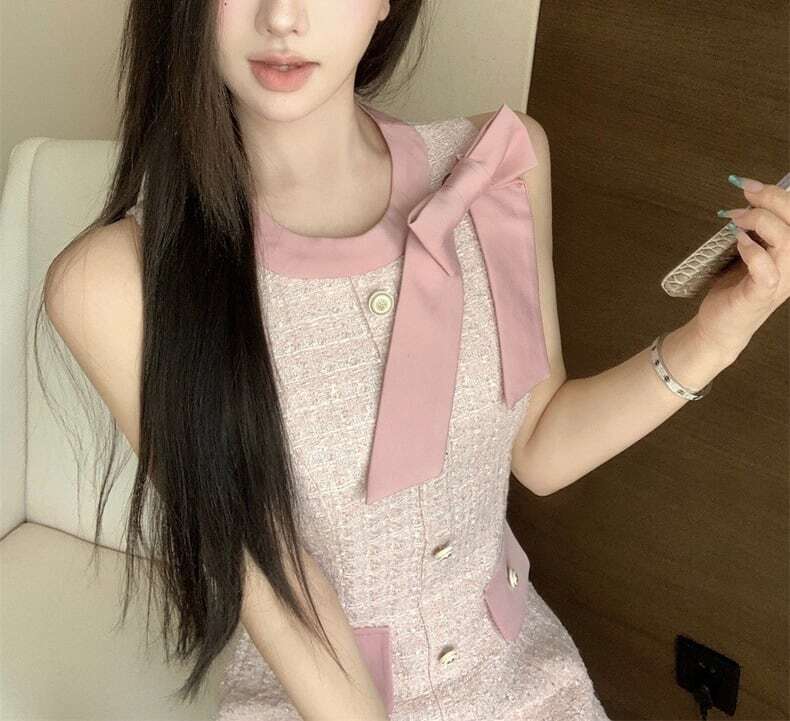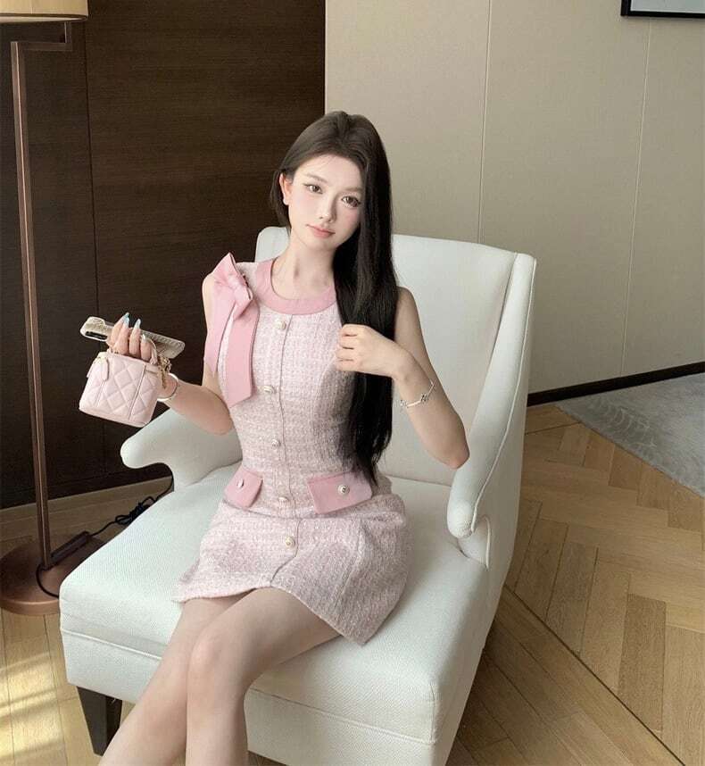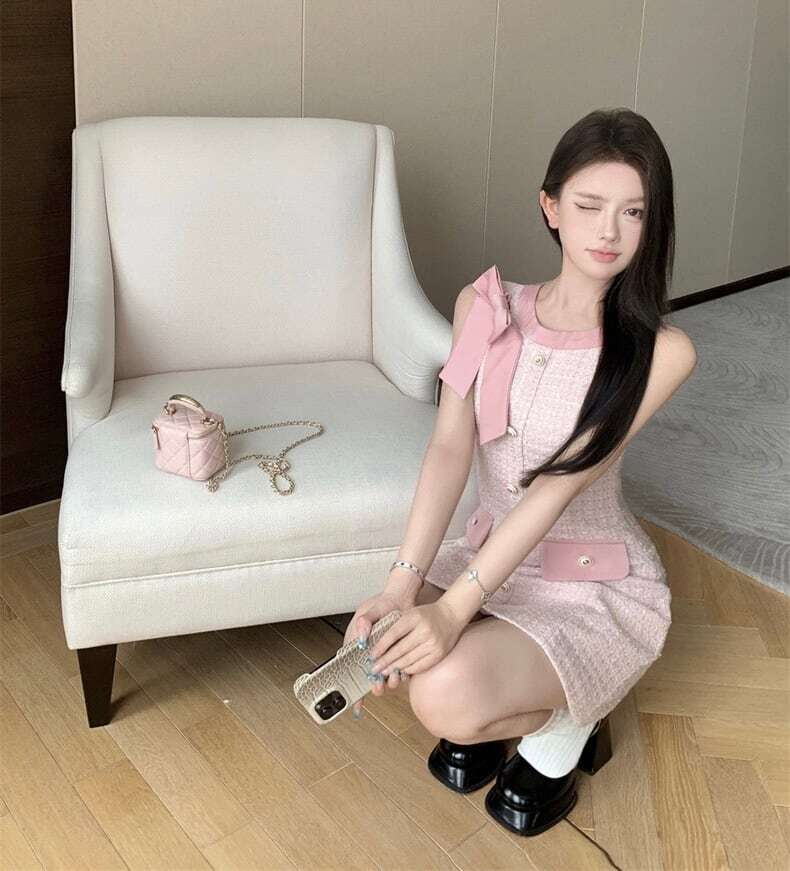 ピンクツイードワンピース サイドリボン ワンピ ミニ フェミニン 韓国ファッション デート KY-49
