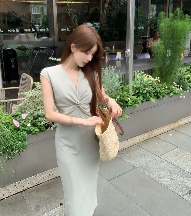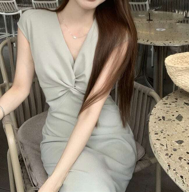 ツイストフレンチスリーブワンピース ミドル丈ワンピース Vネック ワンピ ノースリーブ 上品 エレガント 韓国ファッション お呼ばれ KY-65