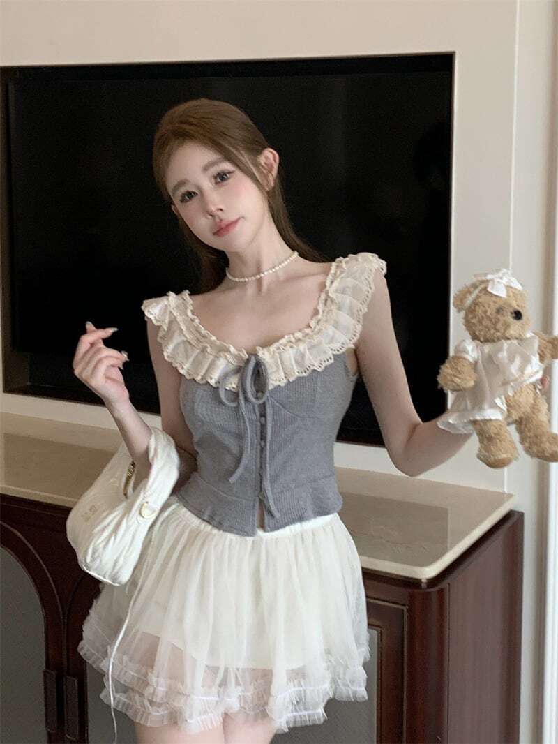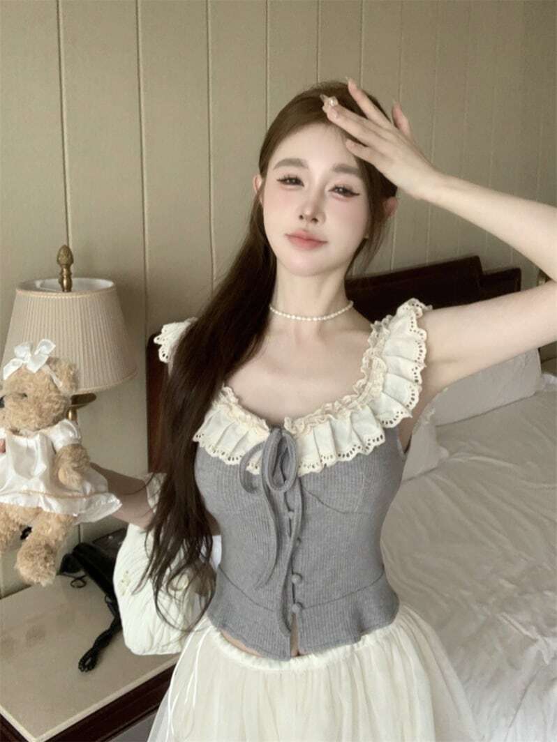 ノースリーブサマーニットトップス レース 肌見せ リボン ガーリー 甘め 韓国 ファッション KY-70